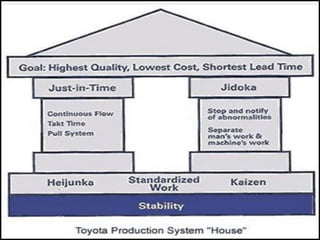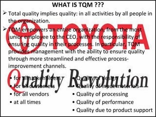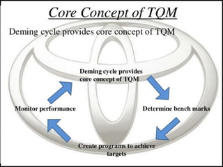 This document discusses the implementation of total quality management (TQM) in manufacturing industries, using Toyota as a reference example. It defines TQM as ensuring quality in all activities and processes through continuous improvement and employee commitment. The key aspects of Toyota's approach discussed are applying the Deming cycle of plan-do-check-act, emphasizing customer satisfaction, empowering employees in quality control, implementing tools like SMED (single minute exchange of die) to reduce setup times, and following the four principles of the Toyota Production System for continuous process improvement.
