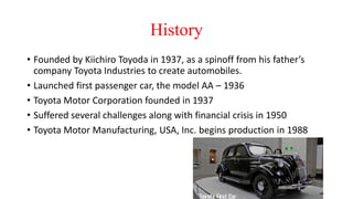 Founded in 1937 by Kiichiro Toyoda, Toyota has grown to become the world's second-largest car manufacturer and a leader in hybrid electric vehicles, notably with models like the Prius. The company emphasizes customer choice and satisfaction by offering a diverse range of vehicles tailored to different markets, supported by innovative manufacturing techniques and a strong commitment to sustainability. Toyota's success is underscored by its ability to adapt to global market conditions and continuously improve operational efficiency.