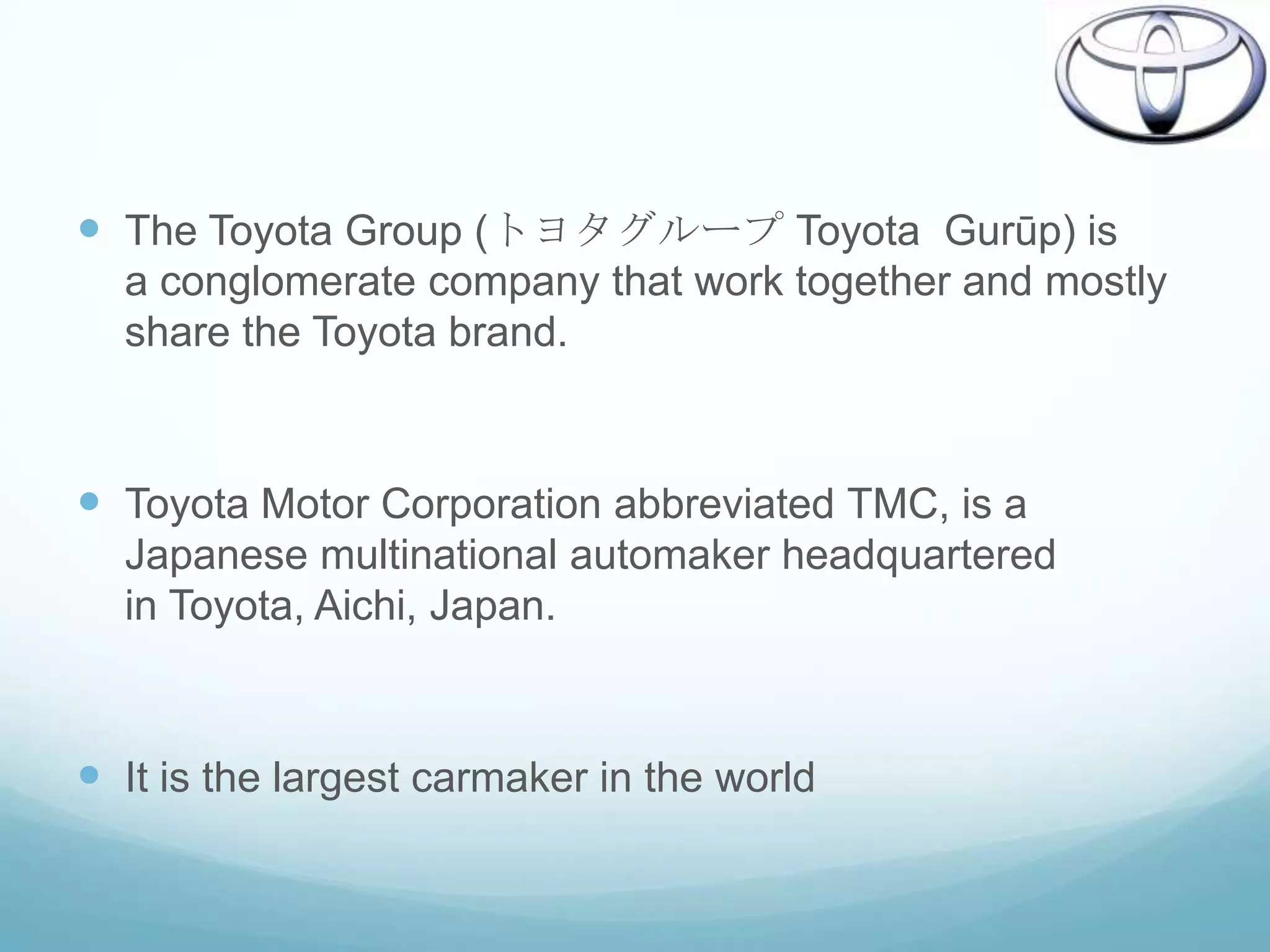 The Toyota Group is a conglomerate, primarily known for Toyota Motor Corporation, the largest carmaker globally. It aims to innovate in mobility and sustainability, emphasizing environmental action and quality in its operations. Its corporate strategy includes diversification, integration, joint ventures, and thorough market analysis to maintain its leading position in the automotive industry.