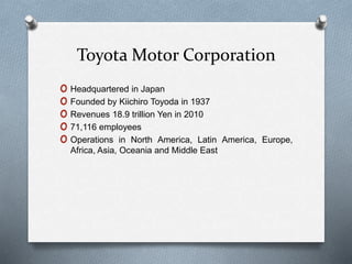 Toyota faced domestic problems in Japan in the late 1990s which led it to announce a globalization plan in 1995. The plan aimed to increase offshore production capacity and global vehicle sales. Toyota expanded globally by establishing local sales networks, auto parts bases, and joint ventures to build vehicles locally. It opened production bases around the world and established global production centers to ensure consistent quality, training, and development across locations. By localizing manufacturing, Toyota was able to achieve a presence in almost all major global vehicle segments and markets by 2010.