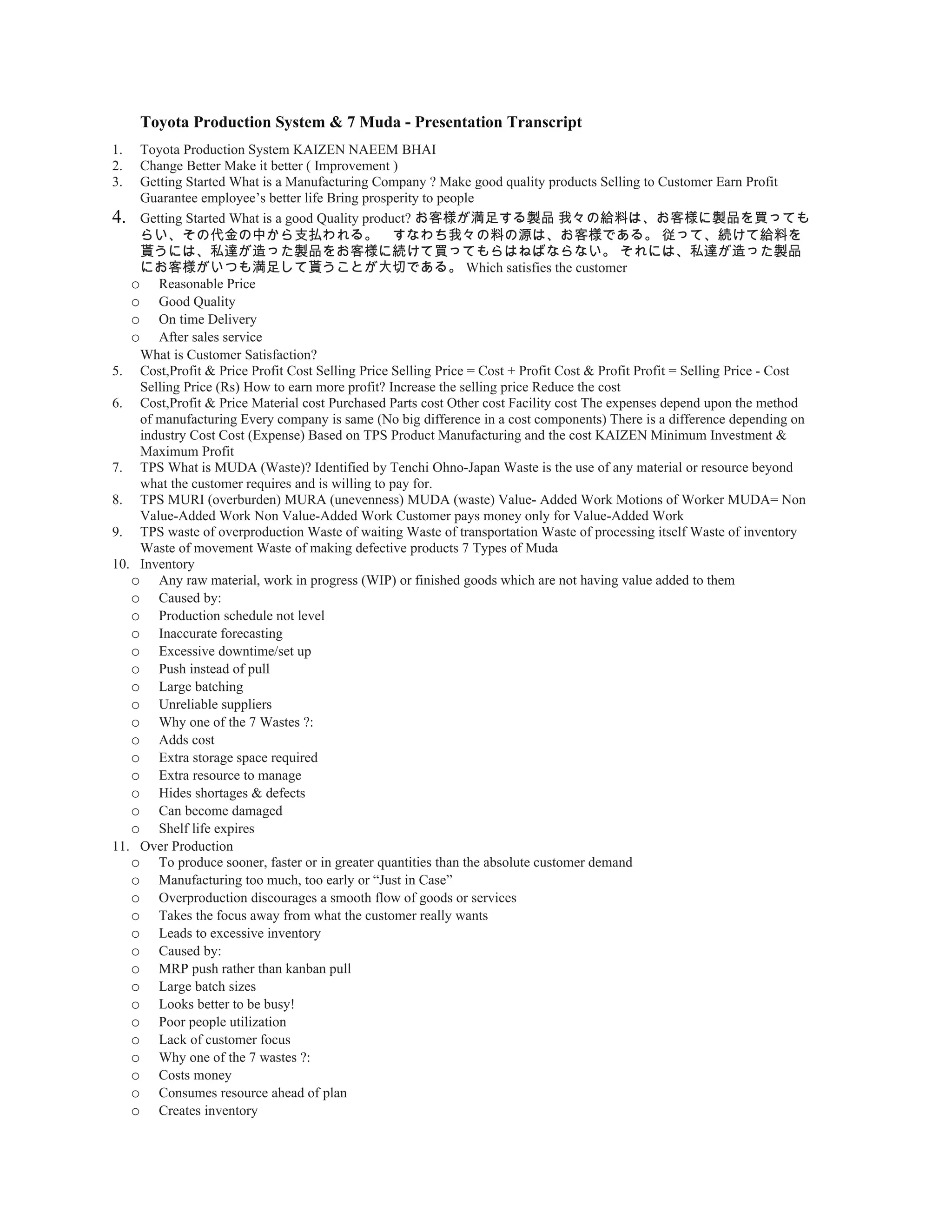 The document summarizes Toyota's Production System (TPS) and the seven types of "muda" or waste. It defines muda as any activity that does not add value from the customer's perspective. The seven types of muda are overproduction, waiting, transportation, processing itself, inventory, unnecessary motion, and defects. The document provides examples and causes of each type of muda, and explains how eliminating muda can help reduce costs and increase profits through just-in-time production and continuous improvement. The overall goal of TPS is to minimize lead time and eliminate all sources of muda.