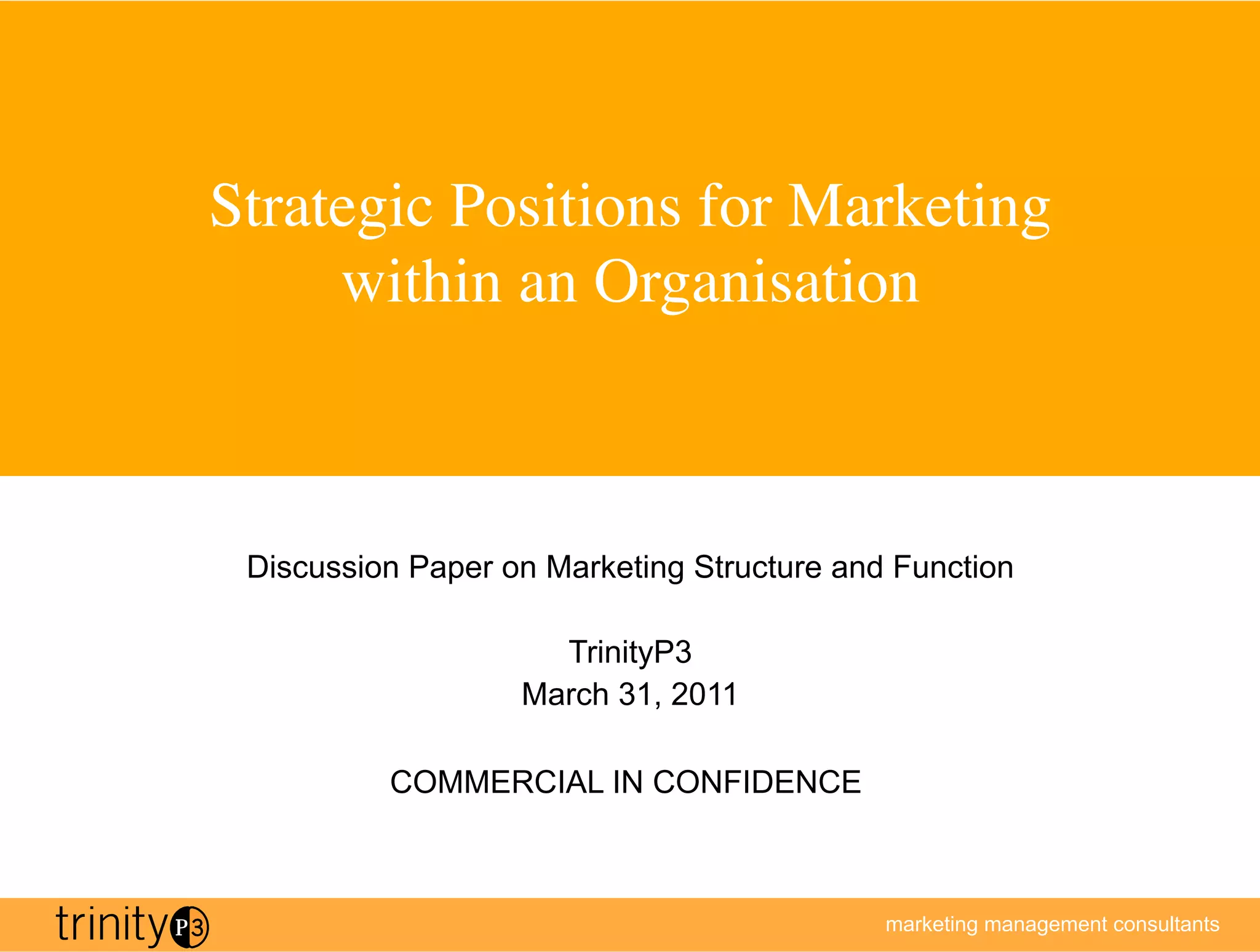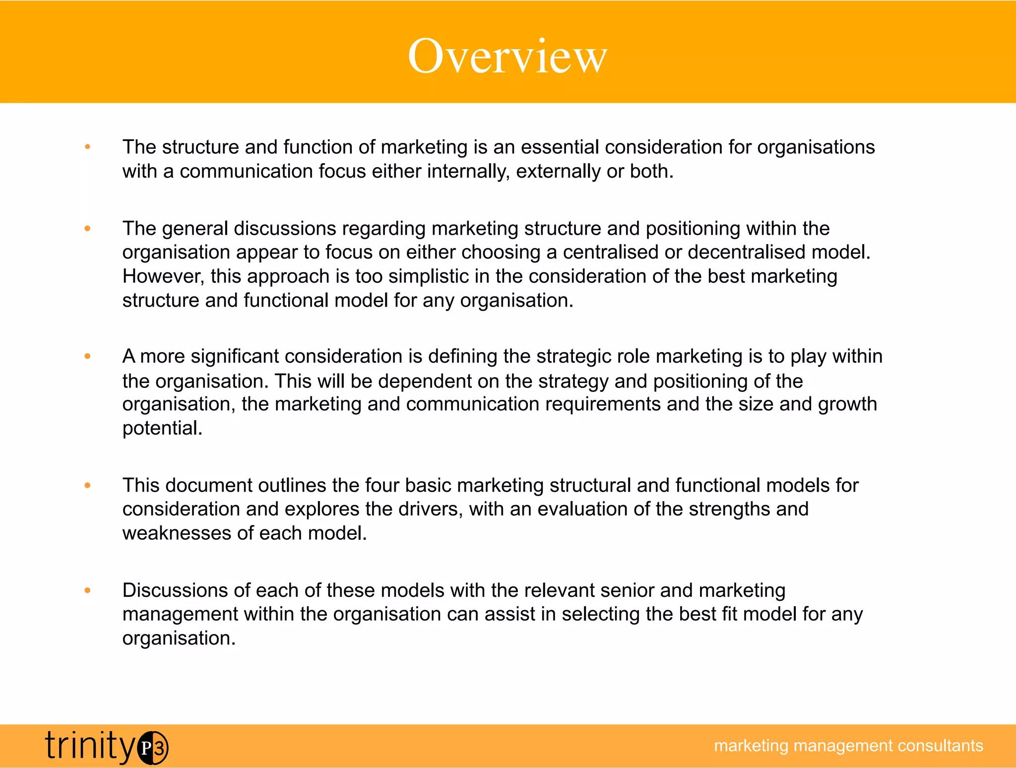 The document discusses the importance of marketing structure and strategy within organizations, emphasizing the need to define the strategic role marketing plays based on the organization's goals and requirements. It outlines four basic marketing models: decentralized supplier, centralized supplier, marketing partner, and marketing leadership, evaluating their strengths and weaknesses. The document also outlines steps for organizations to determine the ideal marketing model suited to their strategic objectives.