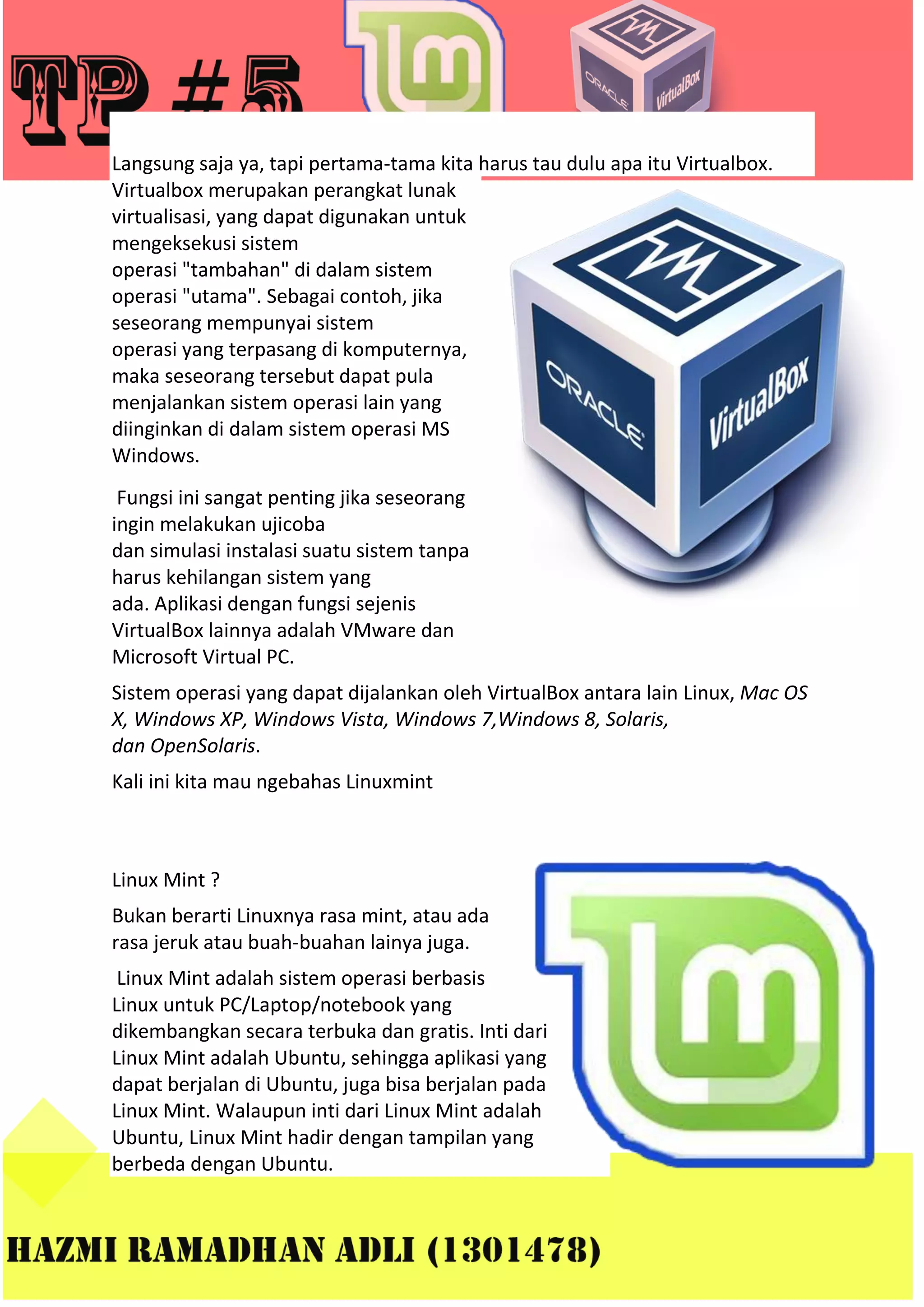 VirtualBox adalah perangkat lunak virtualisasi yang memungkinkan pengguna menjalankan sistem operasi tambahan di dalam sistem operasi utama. Dokumen ini menjelaskan langkah-langkah untuk menginstal Linux Mint menggunakan VirtualBox, termasuk pengaturan dan pemilihan opsi instalasi. Linux Mint adalah sistem operasi berbasis Linux yang dikembangkan secara gratis dan memiliki tampilan berbeda dari Ubuntu.