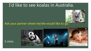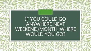 The document discusses potential travel destinations and converting formal language to informal language. It asks the reader where they would like to travel next weekend/month and has them practice asking their partner the same question. It then provides examples of converting formal phrases like "What's the time?" to more informal versions. There is an example email exchange analyzed for functions like requesting information, providing information, and accepting an invitation. Suggestions are given for replacing formal closing phrases like "Yours sincerely" with informal alternatives like "All the best".