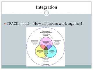 The document discusses the TPACK model which examines how pedagogical knowledge, technological knowledge, and content knowledge integrate and work together for teaching. It emphasizes that teachers need confidence in all three areas and technical proficiency to successfully implement the model. When planning lessons, technology should be used to facilitate learning rather than simply be added on or as an afterthought.