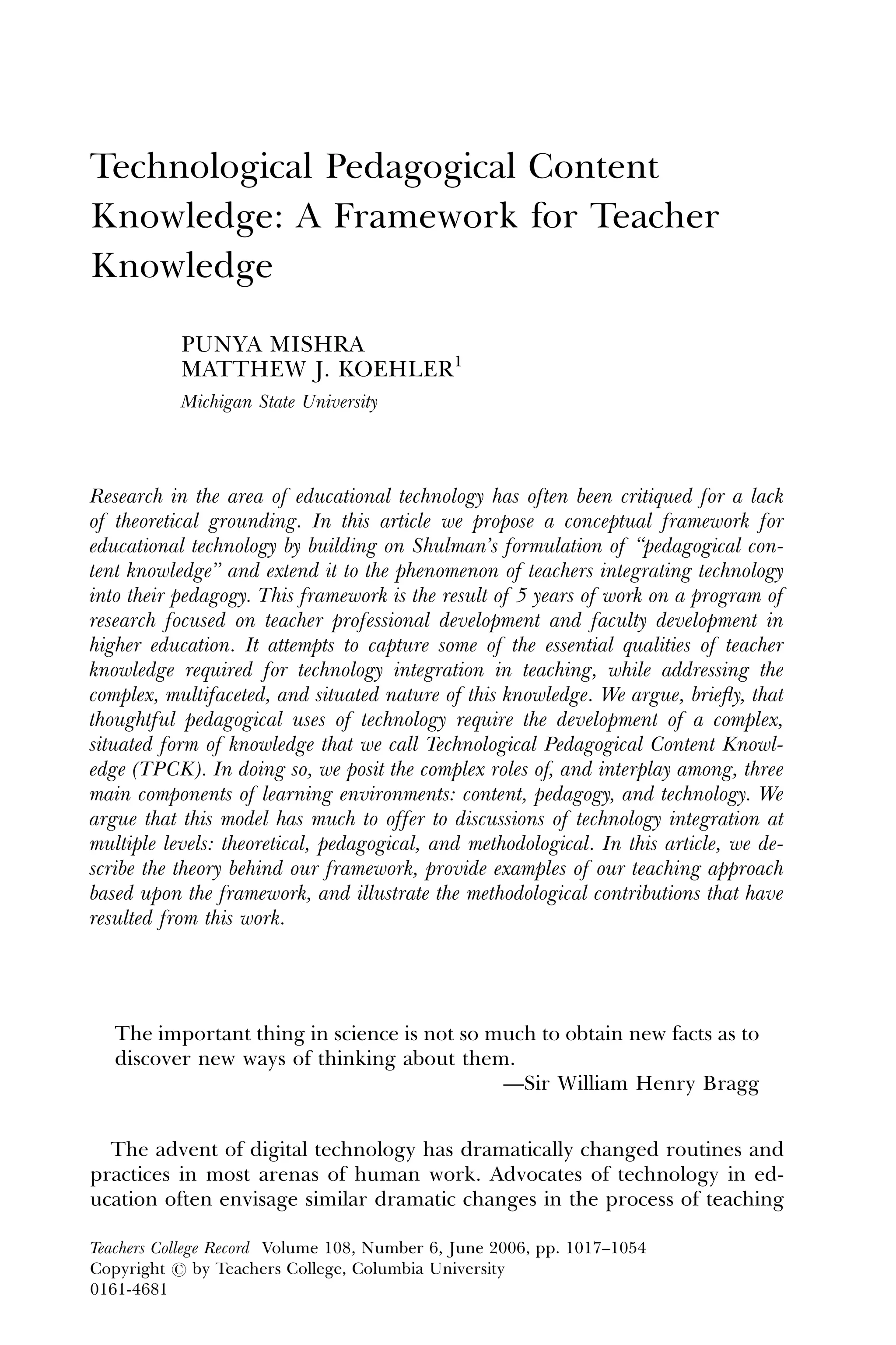 This article proposes a framework called technological pedagogical content knowledge (TPCK) for understanding the knowledge teachers need to effectively integrate technology into their teaching. The framework builds on Shulman's idea of pedagogical content knowledge by adding an additional component of how content, pedagogy, and technology interrelate and influence each other. The authors argue that developing TPCK is important for transforming teacher education, training, and professional development related to educational technology integration. Over five years of research, the authors have studied how teachers develop TPCK and how this framework can guide research on technology integration.