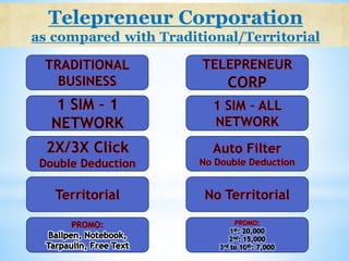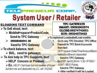 Telepreneur Corp (TPC) is a 100% Filipino-owned multi-level marketing company focused on providing opportunities for Filipinos to earn through the endorsement of prepaid load and wellness products. TPC boasts a reliable e-loading system, a unique compensation plan, and strong IT support, positioning itself as a leading direct-selling company in the prepaid loading category. The company offers various load denominations and emphasizes accessible customer service alongside comprehensive support for its dealers.