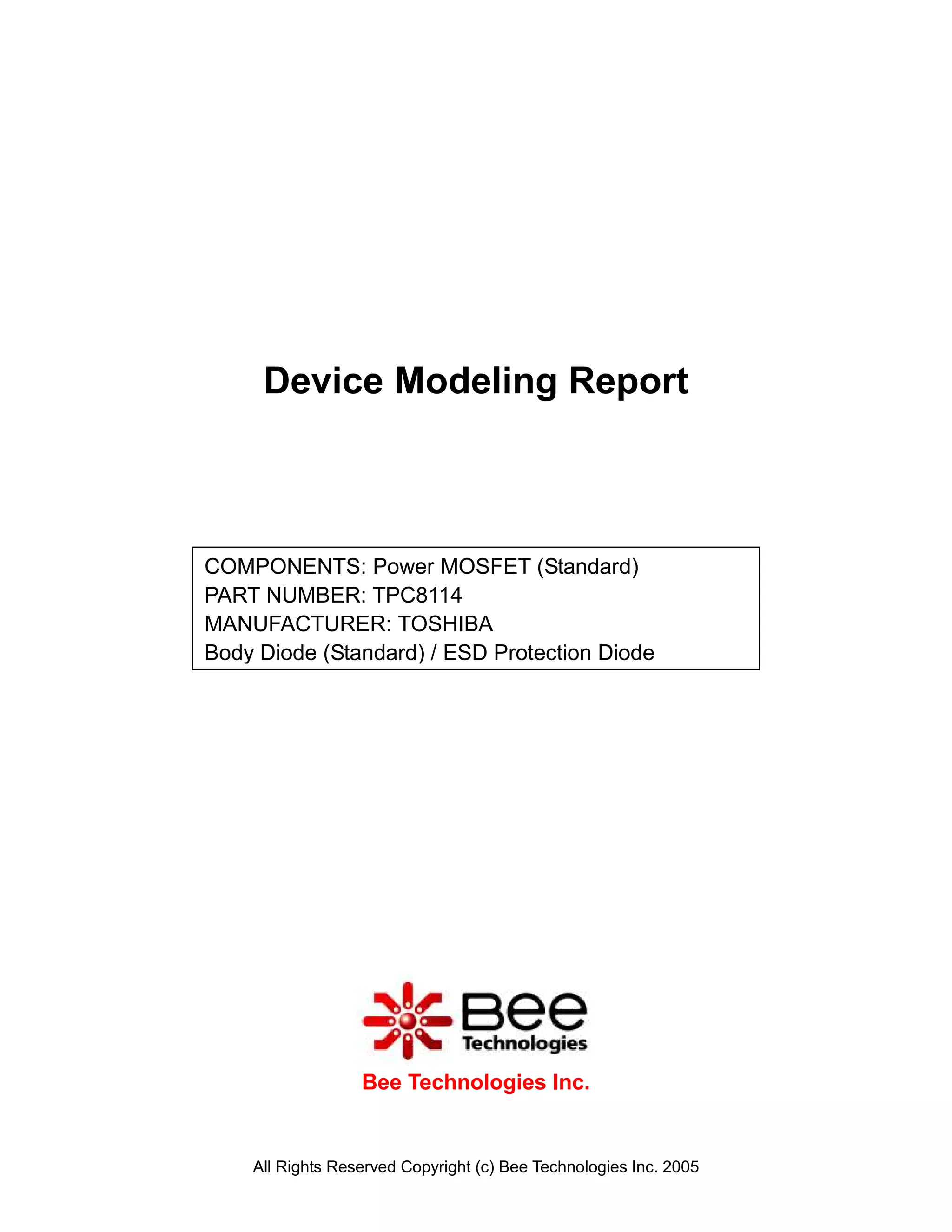 The document provides a detailed modeling report of the Toshiba power MOSFET (TPC8114) and related body diode characteristics, including various electrical parameters, PSpice models, and simulation results. It includes analyses of Vgs-Id characteristics, gate charge, capacitance, switching time, output characteristics, and reverse recovery properties, alongside measurement comparisons to highlight simulation accuracy. Additionally, it incorporates ESD protection diode analysis with zener voltage characteristics, all deemed crucial for understanding device performance.