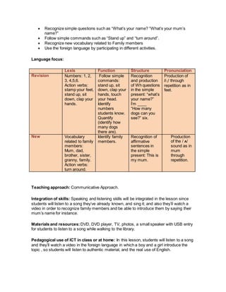 This lesson plan is for a first grade English class focusing on family vocabulary. The teacher will lead the students in singing songs to greet each other and transition between activities. They will then watch a video that introduces vocabulary like mum, dad, brother, and sister through examples of families. Students will practice the vocabulary by counting family members and repeating the words. Finally, the teacher will show photos of her own family and have students share the names of their family members.