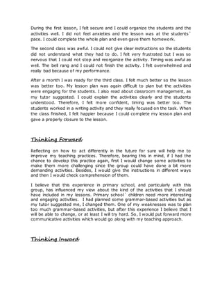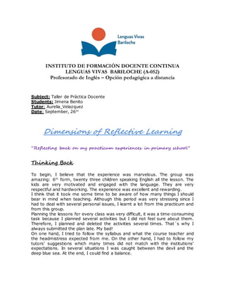 The document is a reflection from a student teacher, Jimena Benito, on her practicum experience teaching English to a 6th form class of 23 students at a primary school. In the first lesson, Jimena felt secure and organized, but the second lesson went poorly as she struggled with instructions and timing. For the third lesson after a month, Jimena incorporated suggestions to improve her lesson planning and classroom management, and felt more confident with a successful lesson. Overall, the experience helped Jimena become aware of strengths and weaknesses to improve future teaching practices, though she remains self-critical of mistakes made.