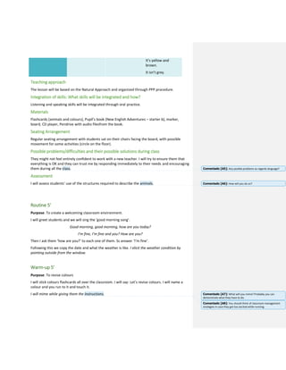 The lesson plan aims to teach students to recognize and describe animals using present simple tense. It begins with a warm-up revising colors using flashcards around the room. Next, the teacher presents new vocabulary for "bird" using flashcards and models descriptive sentences. Students then complete exercises in their workbook describing pictures and listening to descriptions to match animals. The lesson closes with a game revising animals and colors through Chinese whispers. The overall goal is for students to gain confidence using simple present tense to identify and describe basic animal vocabulary.