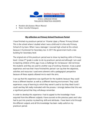 Mirari Marzol completed her practicum period teaching 5th grade English at her former primary school. It was challenging since the students were accustomed to a different teaching style, but both the students and teacher adapted well. The experience allowed Mirari to apply what she had learned in her studies and develop her teaching skills. Both she and the students found the experience meaningful, and it helped Mirari grow as an educator and influenced her future goals. Overall, Mirari was satisfied with how she conducted the practicum and felt it was a valuable learning experience.