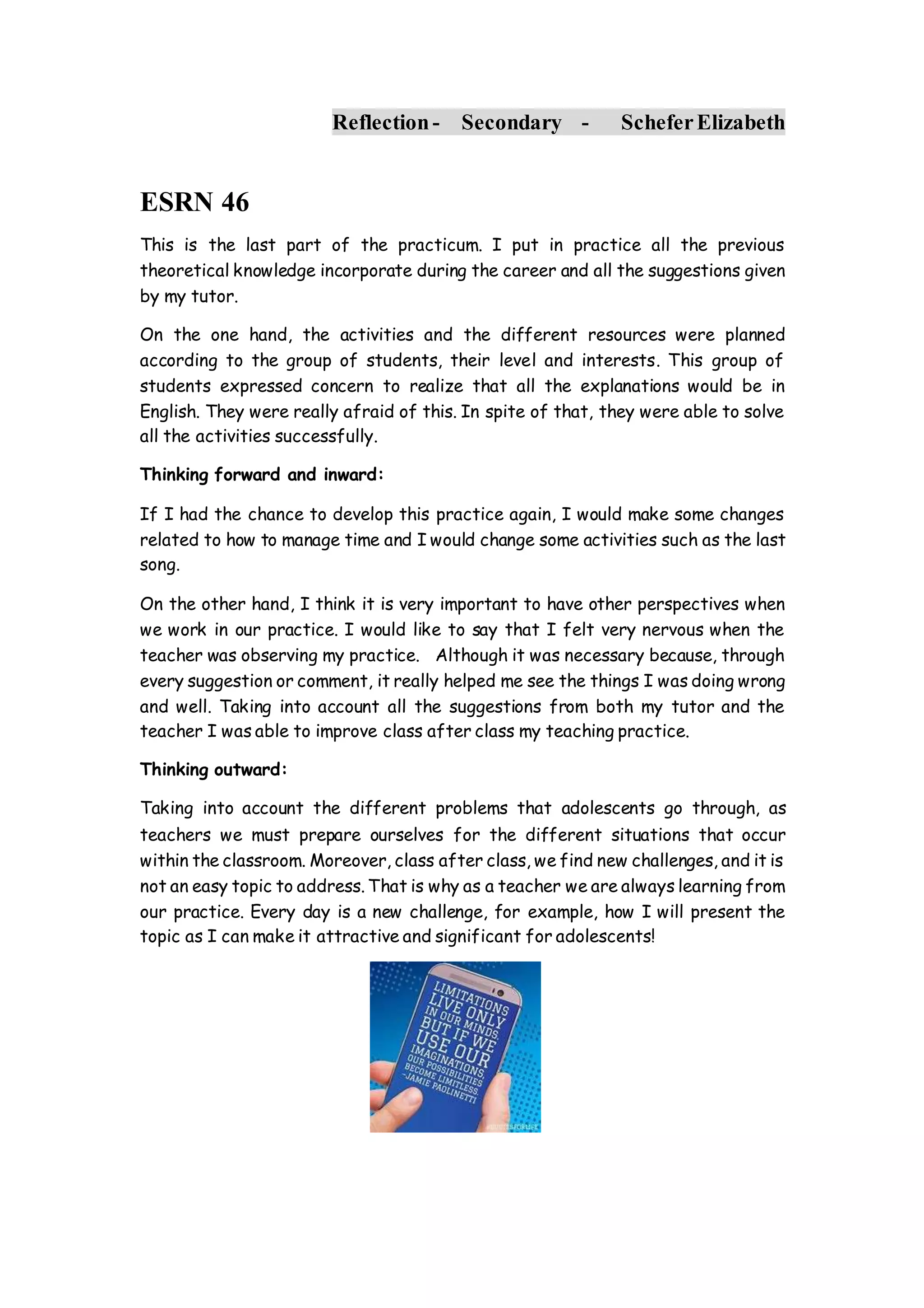 This summarizes a student's reflection on their teaching practicum. The student planned activities according to their students' levels and interests. The students were afraid of being taught in English but were able to complete all activities successfully. The student reflects they would change some time management and activities if they did the practicum again. They found value in receiving feedback from their tutor and teacher to improve their teaching from class to class. As a teacher, they recognize the challenges of addressing adolescent issues and finding new ways to engage students daily.