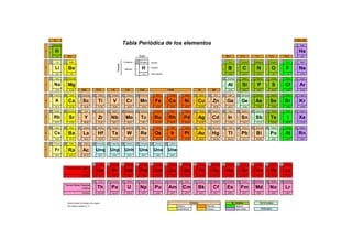 VIIIA (0) 1 Hidrógeno Tabla Periódica de los elementos 2 Helio 1 +1 H 0 He 1,01 IIA Grupo IIIA IVA VA VIA VIIA 4,00 3 Litio 4 Berilio Nº atómico → 1 Hidrógeno ← Nombre 5 Boro 6 Carbono 7 Nitrógeno 8 Oxígeno 9 Flúor 10 Neon Periodo -1 -2 -3 -4 -5 2 Li Be H ← Símbolo B C N O F Ne -2 +-4 Valencias → +1 +2 +1 +3 -2 -1 0 6,94 9,01 1,01 ← Peso atómico 10,81 12,011 14,01 16 19 20,18 11 Sodio 12 Magnesio 13 Aluminio 14 Silicio 15 Fósforo 16 Azufre 17 Cloro 18 Argon -1 -3 -5 -7 Na Mg Al Si P S Cl Ar +1 +3 +5 -2 -4 -6 3 +2 +4 +1 +2 +3 0 22,99 24,305 IIIB IVB VB VIB VIIB VIIIB IB IIB 26,98 28,09 30,97 32,06 35,45 39,95 19 Potasio 20 Calcio 21 Escandio 22 Titanio 23 Vanadio 24 Cromo 25 Manganeso 26 Hierro 27 Cobalto 28 Niquel 29 Cobre 30 Cinc 31 Galio 32 Germanio 33 Arsénico 34 Selenio 35 Bromo 36 Kripton +2+3+4+6+7 +2 +3 +4 +5 -1 -3 -5 -7 K Ca Sc Ti V Cr Mn Fe Co Ni Cu Zn Ga Ge As Se Br Kr +2 +3 +4 +2 +3 +6 -2 -4 -6 4 +2 +3 +2 +3 +2 +3 +1 +2 +2 +4 +3 +5 +1 +2 +3 +2 +3 0 39,10 40,08 44,96 47,90 50,94 52,00 54,94 55,85 58,93 58,70 63,546 65,38 69,72 72,59 74,92 78,96 79,90 83,80 37 Rubidio 38 Estroncio 39 Itrio 40 Circonio 41 Niobio 42 Molibdeno 43 Tecnecio 44 Rutenio 45 Rodio 46 Paladio 47 Plata 48 Cadmio 49 Indio 50 Estaño 51 Antimonio 52 Teluro 53 Yodo 54 Xenon +2 +3 +4 +5 +3 +4 +5 +6 +1 +2 +3 +4 -1 -3 -5 -7 Rb Sr Y Zr Nb Mo Tc Ru Rh Pd Ag Cd In Sn Sb Te I Xe -2 -4 -6 5 +3 +4 +3 +4 +2 +4 +3 +5 +1 +2 +3 +4 +4 +1 +2 +3 0 85,47 87,62 88,90 91,22 92,91 95,94 (98)* 101,07 102,91 106,42 107,87 112,41 114,82 118,71 121,75 127,60 126,90 131,29 55 Cesio 56 Bario 57 Lantano 72 Hafnio 73 Tántalo 74 Wolframio 75 Renio 76 Osmio 77 Iridio 78 Platino 79 Oro 80 Mercurio 81 Talio 82 Plomo 83 Bismuto 84 Polonio 85 Astato 86 Radon +4 +5 +6 +7 -1 -3 -5 -7 Cs Ba La Hf Ta W Re Os Ir Pt Au Hg Tl Pb Bi Po At Rn +3 +4 +5 -2 -4 -6 6 +4 +6 +2 +4 +1 +3 +1 +2 +1 +3 +2 +4 +3 +5 +1 +2 +3 +4 +4 +3 0 132,91 137,33 138,91 178,49 180,95 183,85 186,21 190,20 192,22 195,08 196,97 200,59 204,38 207,2 208,98 (209)* (210)* (222)* 87 Francio 88 Radio 89 Actinio 104 Unilcuadio 105 Unilpentio 106 Unilhexio 107 Unilseptio 108 Uniloctio 109 Unilenio 7 Fr Ra Ac Unq Unp Unh Uns Uno Une +1 +2 +3 - - - - - - (223)* 226,03 227,03 (261)* (262)* (263)* (264)* (265)* (266)* 58 Cerio 59 Praseodimio 60 Neodimio 61 Prometio 62 Samario 63 Europio 64 Gadolinio 65 Terbio 66 Disprosio 67 Holmio 68 Erbio 69 Tulio 70 Yterbio 71 Lutecio Tierras Raras Ligeras Ce Pr Nd Pm Sm Eu Gd Tb Dy Ho Er Tm Yb Lu +3 +4 +3 +4 +2 +3 +3 +4 (TRLs) +3 +3 +3 +3 +3 +3 +3 +3 +3 +3 Lantánidos 140,12 140,91 144,24 (145)* 150,36 151,96 157,25 158,92 162,50 164,93 167,26 168,93 173,04 174,97 90 Torio 91 Protactinio 92 Uranio 93 Neptunio 94 Plutonio 95 Americio 96 Curio 97 Berkelio 98 Californio 99 Einstenio 100 Fermio 101 Mendelevio 102 Nobelio 103 Laurencio Tierras Raras Pesadas Th Pa U Np Pu Am Cm Bk Cf Es Fm Md No Lr +3 +4 +5 +3 +4 +5 +2 +3 +4 +3 +4 (TRPs) +4 Actínidos 232,038 321,04 238,03 (237)* (239)* (243)* (247)* (247)* (251)* (252)* (257)* (258)* (259)* (260)* * Número másico del isótopo más longevo Metales No metales Semimetales Peso atómico basado en 12C Alcalinos Platinoides Halógenos Alcalinotérreos Preciosos Gases Nobles Artificiales