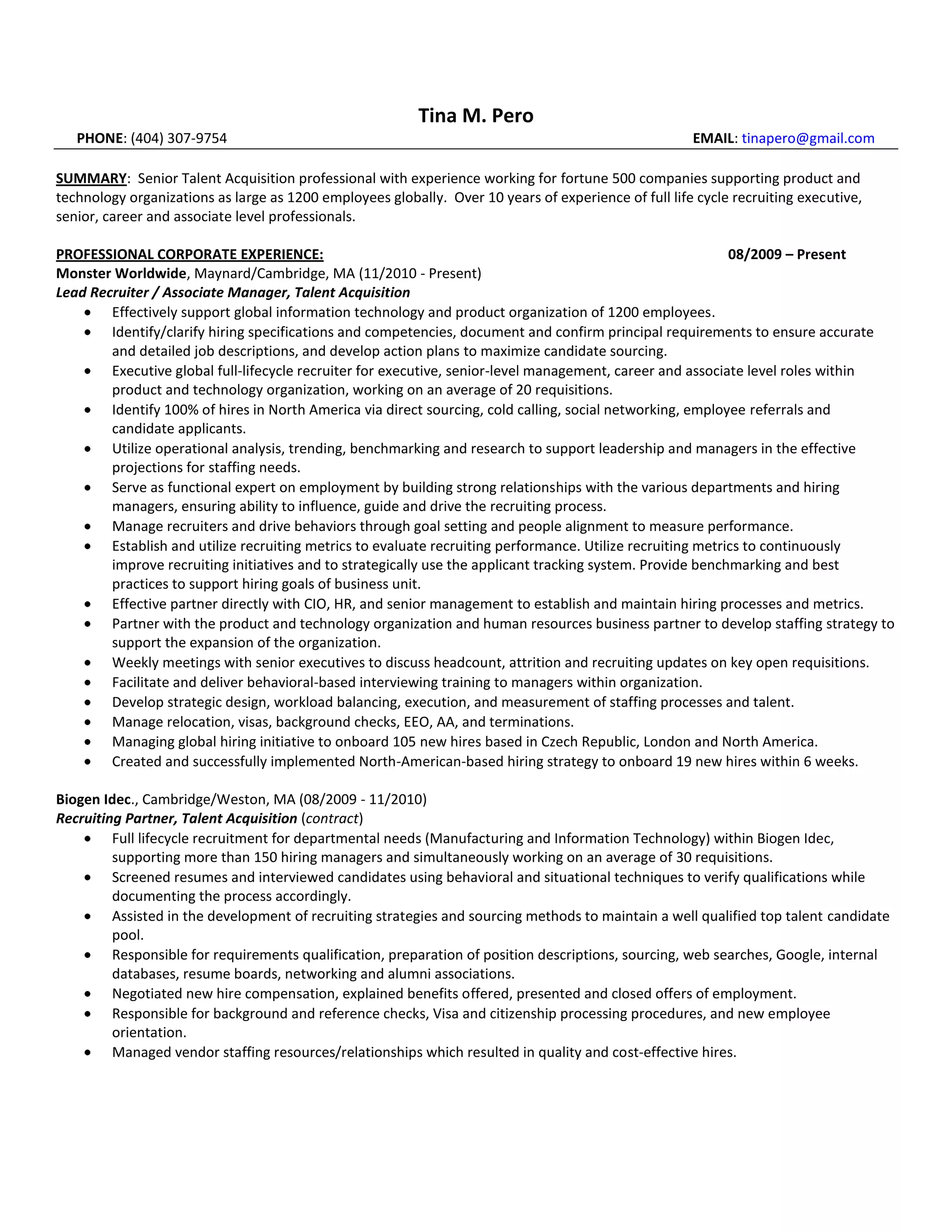 This document provides a summary of Tina M. Pero's experience as a senior talent acquisition professional with over 10 years of experience recruiting for technology and product organizations. She has worked for Fortune 500 companies recruiting executives, senior level professionals, and associates. Her experience includes full lifecycle recruiting, developing hiring strategies, managing other recruiters, and partnering with senior leadership.