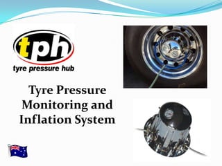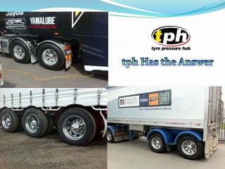 The document summarizes a Tyre Pressure Monitoring and Inflation System called the TPH hub. The TPH hub is a device that fits onto truck and trailer wheels to monitor and manage tyre pressure. It consists of a hub with two air gauges and air lines connected to the tyre valves to make inflating easy. The TPH system aims to improve safety, reduce costs from fuel and tyres, and lower greenhouse emissions by enabling accurate and constant monitoring of tyre pressure.