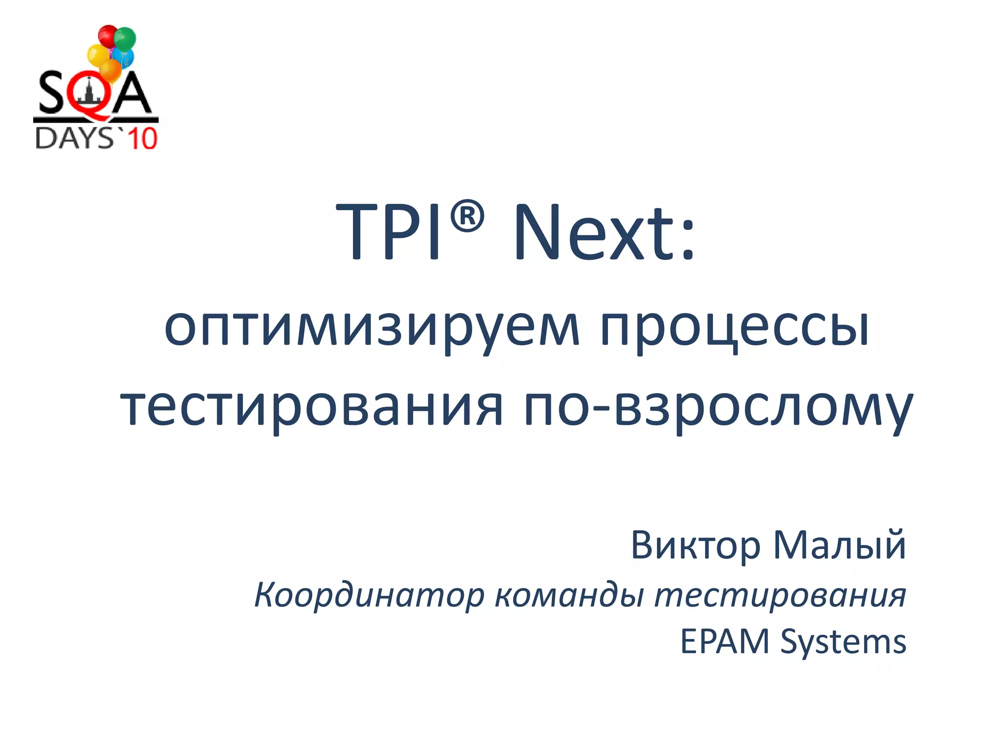 Документ обсуждает методологию tpi® next для оптимизации процессов тестирования, акцентируя внимание на увеличении качества, прибыли и прогнозируемости. Приводятся ключевые элементы модели, этапы оценки и рекомендации по удачному внедрению, а также преимущества и недостатки подхода. Кроме того, выделяются контрольные точки и уровни зрелости для различных областей тестирования.