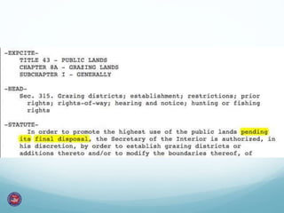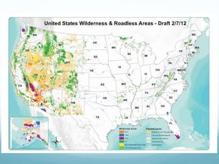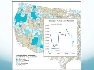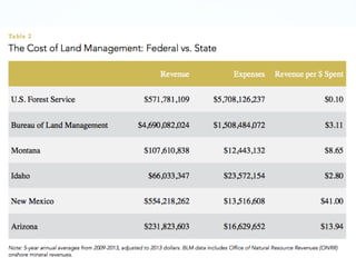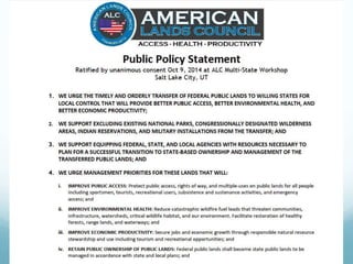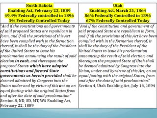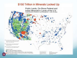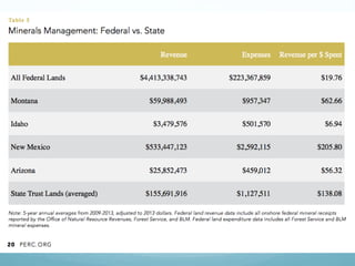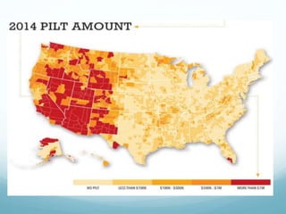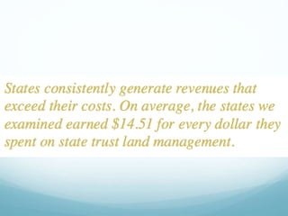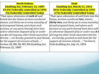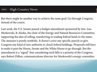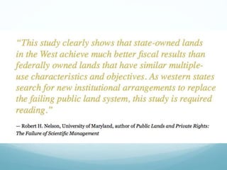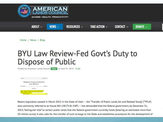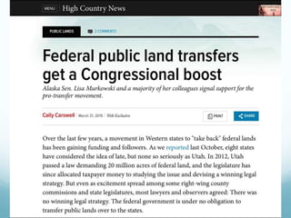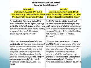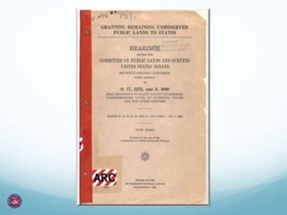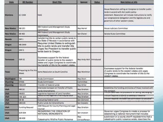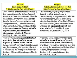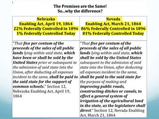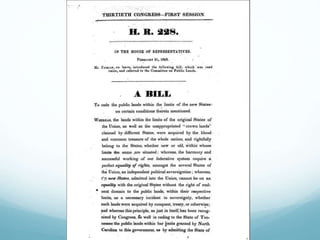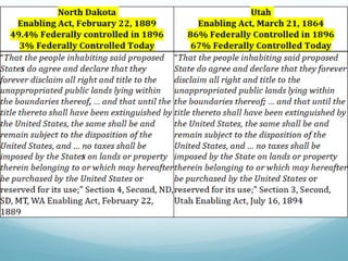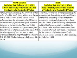 This document discusses the unequal treatment of Western states compared to Eastern states with regards to federally controlled public lands. It notes that while Eastern states had sovereignty over their lands from the beginning, Western states had over 90% of their lands controlled by the federal government indefinitely. It highlights the arguments made by Illinois Representative Orlando Ficklin in 1848 for a bill to cede public lands to the states, including that all states must have equal sovereignty and rights to develop their resources. It also discusses how Senator Thomas Hart Benton of Missouri relentlessly advocated for reforming the system to transfer more control of public lands to the states.