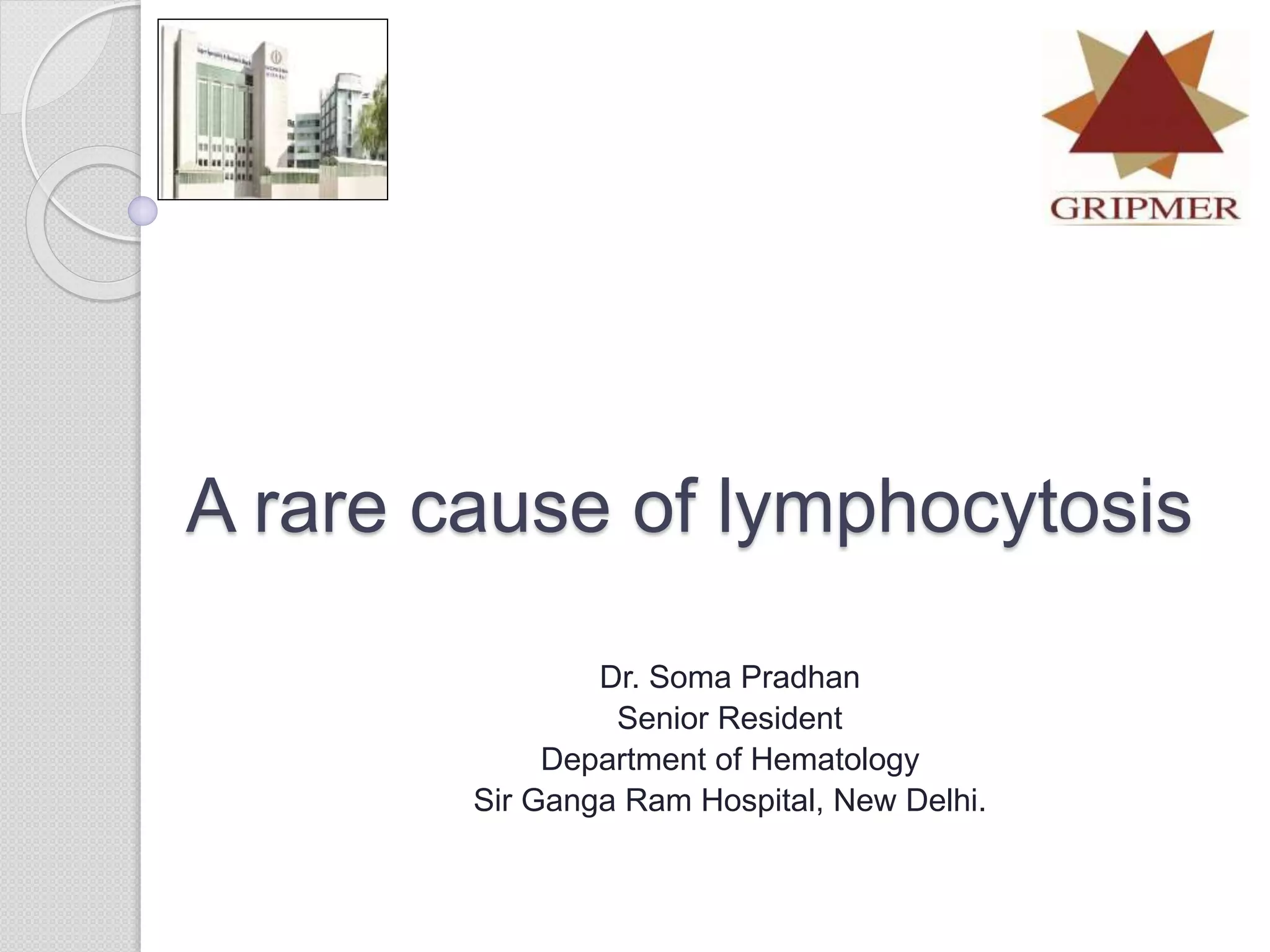 This document presents a case study of a 42-year-old male who presented with abdominal pain and was found to have a markedly elevated lymphocyte count on blood tests. Further testing revealed the lymphocytes to be abnormal in morphology. Bone marrow biopsies and additional testing led to a diagnosis of T-cell prolymphocytic leukemia (T-PLL), a rare and aggressive form of T-cell lymphoma. The document discusses the clinical features, distinguishing characteristics from other lymphomas, molecular genetics, disease progression, and poor prognosis of T-PLL.