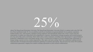 The Hong Kong Polytechnic University (PolyU) is ranked sixth in the 2021 QS list of best institutions under 50, recognized for its academic reputation and diverse offerings. It provides comprehensive courses with international exchange programs and impactful research across various fields, establishing collaborations with over 270 foreign institutions. With world-class facilities and a vibrant cultural environment, PolyU supports non-local graduates in finding employment in Hong Kong.