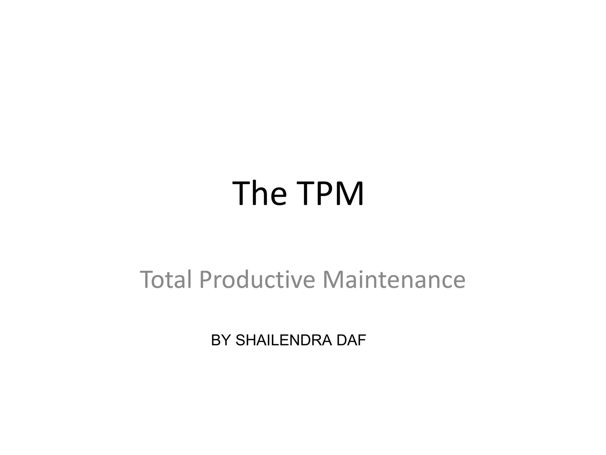 The document discusses Total Productive Maintenance (TPM), including its definition, principles, pillars, implementation process, strategies, benefits, and a case study. TPM aims to maximize equipment effectiveness through autonomous maintenance by operators and planned maintenance. The eight pillars of TPM are education and training, safety, autonomous maintenance, planned maintenance, equipment improvement, quality management, early equipment management, and TPM in offices. Human-oriented and process-oriented strategies are described for implementing TPM. Benefits include increased productivity, uptime, capacity and ROI. A case study found that both strategies positively impact TPM implementation levels.