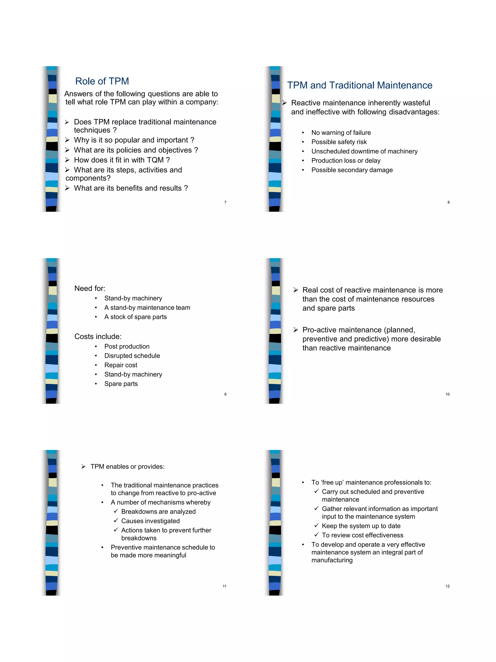 Total Productive Maintenance (TPM) is a Japanese approach for maximizing equipment effectiveness through the involvement of both maintenance and operations personnel. It aims to eliminate breakdowns and failures, accidents, and defects. The key aspects of TPM include establishing autonomous maintenance by operators, improving equipment reliability, detecting and eliminating faults and problems, and establishing clean and tidy workplaces. TPM was developed in Japan and has led to significant results like increased productivity and reduced costs when implemented successfully.