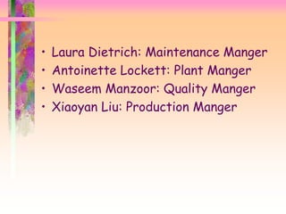 The document outlines the agenda and topics for a meeting on Total Productive Maintenance (TPM). The agenda covers understanding downtime, major losses, an introduction to TPM including its history and goals, launching a TPM program through various stages, and overall equipment efficiency (OEE). Specific managers are assigned to lead discussions on sub-topics such as planned vs unplanned downtime, the eight pillars of TPM, and calculating OEE. The overall goal of the meeting is to introduce an approach for continuous equipment improvement using TPM.