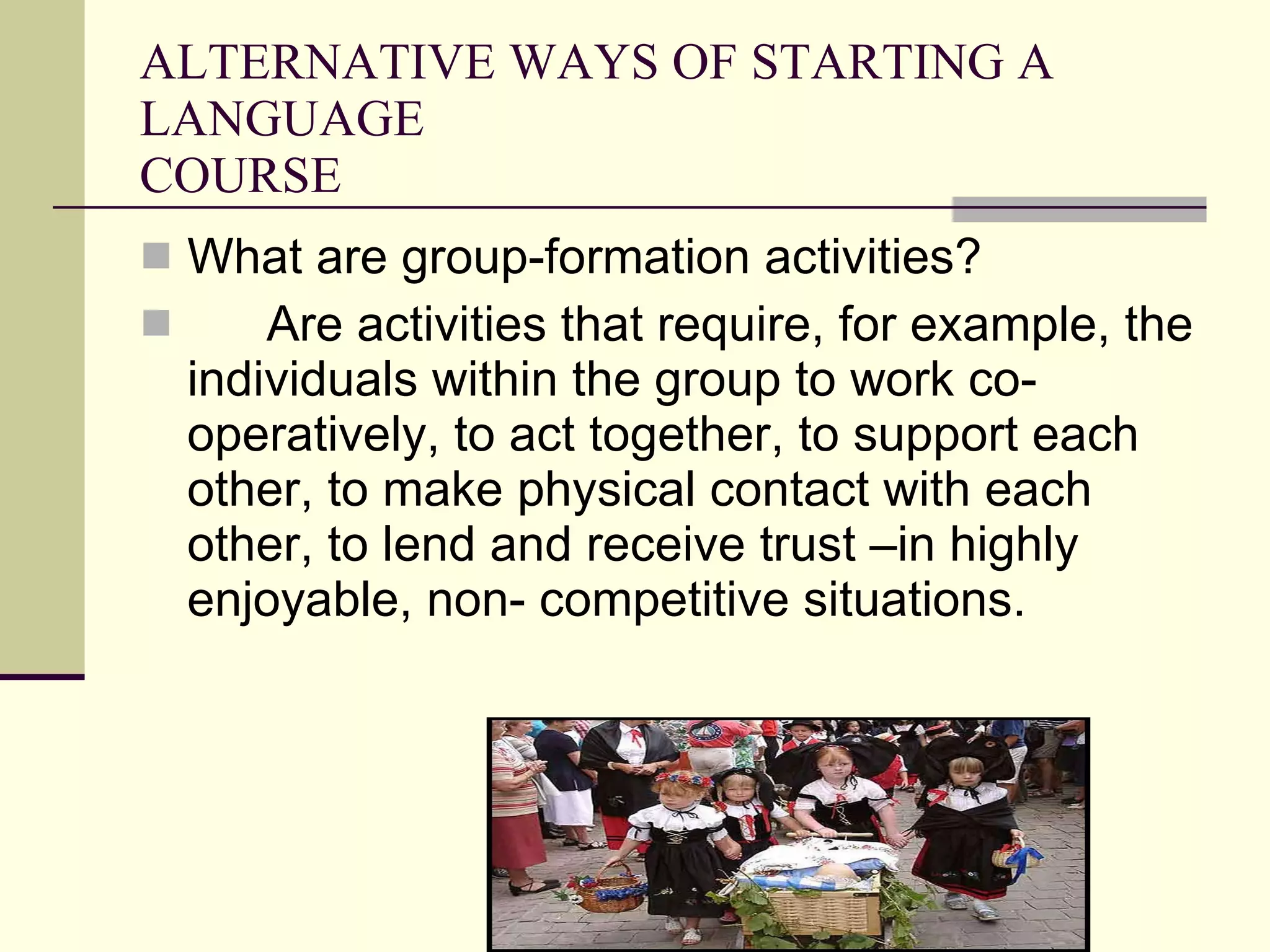 Group formation activities aim to build trust and cooperation among students. They include tasks that require students to work together physically and emotionally. This helps lower affective barriers, boosting confidence and allowing students to support each other in learning. Creating a supportive environment through continual group activities can lead to more collaborative work and a positive learning space where students feel comfortable taking risks with the new language. Effective sequences begin with icebreakers and games involving vocabulary and move to activities pairing language practice with storytelling, reading, and games to reinforce topics through total physical response techniques.
