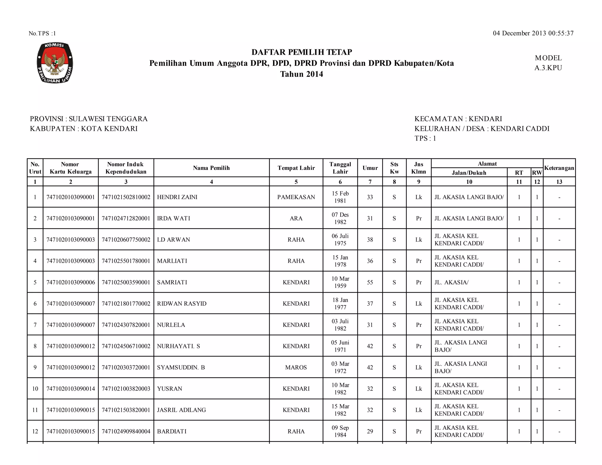 KELURAHAN / DESA : KENDARI CADDI