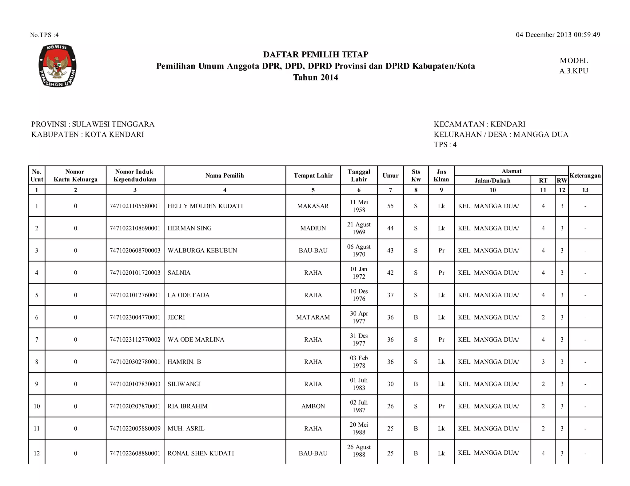 KABUPATEN : KOTA KENDARI