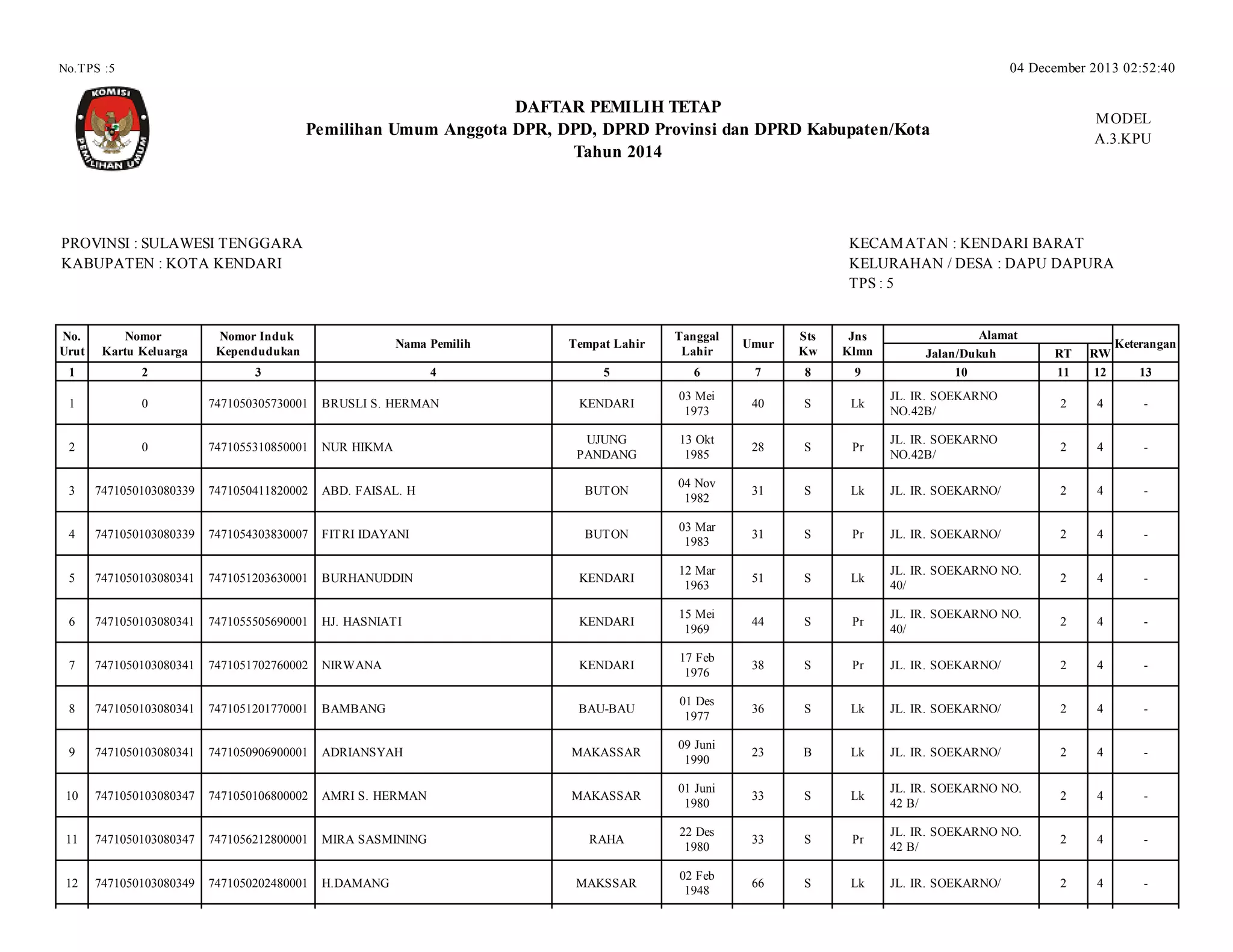 This document contains a list of 65 registered voters in polling station 5 of the Dapu Dapura neighborhood in Kendaran Barat district of Kendaran city, Southeast Sulawesi province. It includes each voter's family card number, identity card number, name, place of birth, date of birth, age, marital status, gender, address, neighborhood, and any notes. The list provides key identifying information about eligible voters in this particular polling station for the 2014 elections of members of the House of Representatives, Regional Representatives Council, provincial legislature, and district/city legislature in Indonesia.