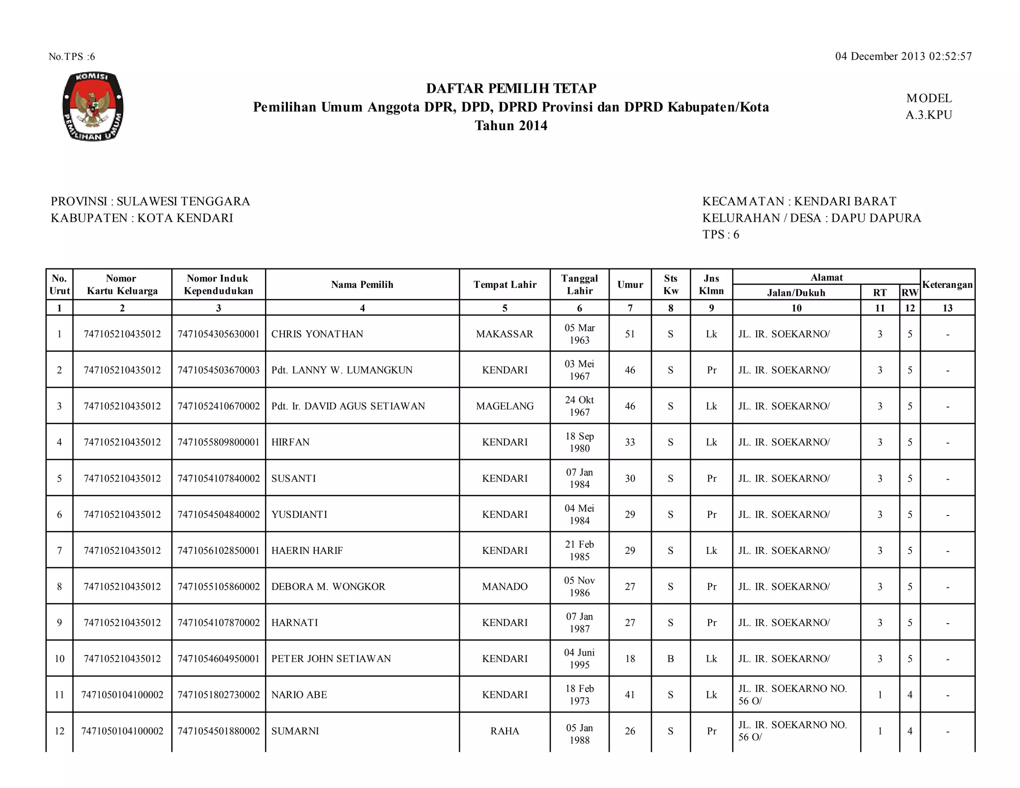 This document contains a list of 66 registered voters in the village of Dapu Dapura, Kecamatan KendarI Barat, Kota KendarI, Sulawesi Tenggara for the 2014 elections to the DPR, DPD, provincial and regency/city DPRDs. It includes each voter's family card number, ID number, name, place of birth, date of birth, age, marital status, gender, address and neighborhood details.