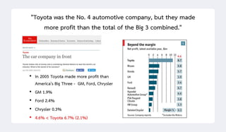 This document compares the Toyota Production System (TPS) and lean manufacturing, detailing their principles, applications, and differences. It emphasizes waste elimination, continuous improvement, and methodologies like value stream mapping and kaizen in various sectors, including automotive and healthcare. The discussion highlights the evolving nature of lean practices, especially with the integration of digital technologies and a focus on sustainability.