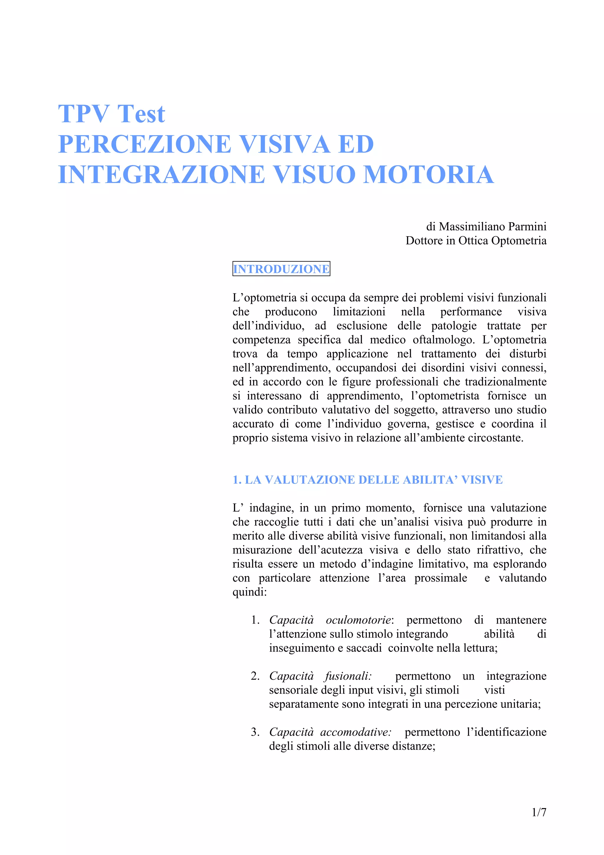 Il documento discute l'importanza dell'optometria nella valutazione e nel trattamento dei disturbi visivi funzionali, in particolare nei bambini con difficoltà di apprendimento. Presenta il Test di Percezione Visiva (TPV), un metodo valutativo che misura le abilità visuo-percettive e visuo-motorie, utile per identificare le difficoltà specifiche e supportare le terapie riabilitative. Vengono illustrate le componenti del processo visivo e l'importanza del confronto tra diversi punteggi per una diagnosi accurata.