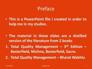This document contains a PowerPoint presentation created by Sourabh Jain to help with his studies. The presentation provides a summary of key concepts from two books on total quality management, covering topics such as leadership, customer satisfaction, employee involvement, continuous process improvement, and performance measurement. It also discusses important quality thinkers and the benefits of implementing a total quality management system.