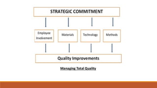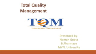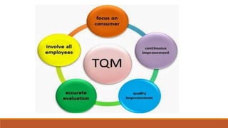 The document discusses Total Quality Management (TQM) in the pharmaceutical industry. It explains that TQM aims to prevent defects rather than just detect them after the fact. This is important for pharmaceuticals since mistakes can have serious or fatal health consequences. TQM requires an organized effort across an entire company to continuously improve quality at every stage of production. It is built upon foundations of ethics, integrity, and trust and requires training, teamwork, leadership, communication, and recognition. The goal of TQM is long-term success through customer satisfaction.