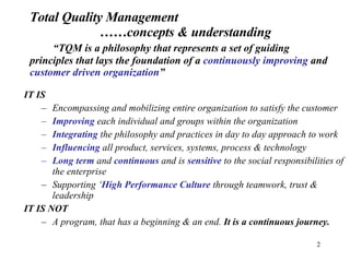 The document discusses concepts related to Total Quality Management (TQM) including its philosophy, focus elements, history, and key principles. It describes TQM as a continuous improvement philosophy that aims to satisfy customers and mobilize the entire organization. The document outlines criteria for evaluating organizations, including leadership, strategic planning, customer focus, information analysis, human resource development, process management, and business results. It provides examples of how TQM principles can be applied to areas like strategic planning, customer satisfaction, process management, and human resource development.
