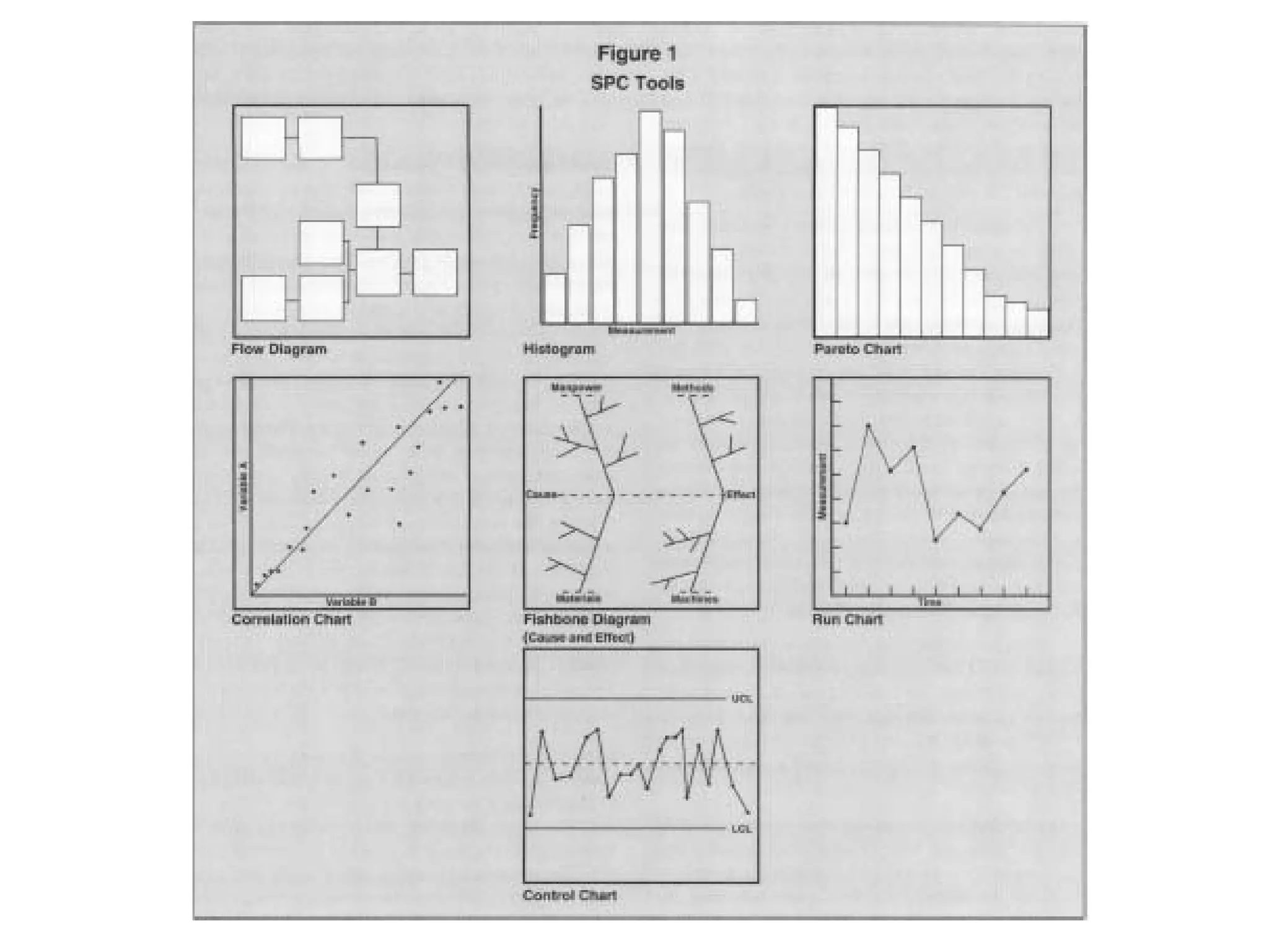 Statistical process control (SPC) uses statistical methods to analyze processes and identify opportunities for improvement by comparing process parameters to standards. The document discusses several statistical techniques used in SPC, including control charts for variables, attributes, defects and process capability. Control charts are used to determine if a process is in statistical control by monitoring for deviations from standards.