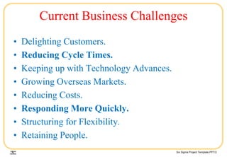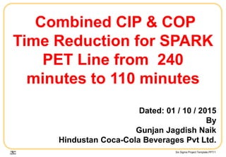 This document outlines a Six Sigma project to reduce the combined cleaning-in-place (CIP) and cleaning-out-of-place (COP) time for a PET line from 240 minutes to 110 minutes. It provides background on the current process, defines the project goals and scope, establishes a charter and timeline, and documents initial process mapping and data collection plans. The project aims to decrease downtime and increase production capacity by streamlining the CIP/COP workflow and eliminating non-value-added steps.
