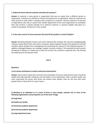 The document outlines topics on total quality management, including definitions of internal and external customers, concerns regarding product pricing, and improvement strategies like the Juran Trilogy and PDSA cycle. It also addresses building supplier relationships, performance measures for various organizations, and the purpose of ISO 9000 quality systems. Additionally, it explores customer requirements and attributes for product development in quality by design initiatives.