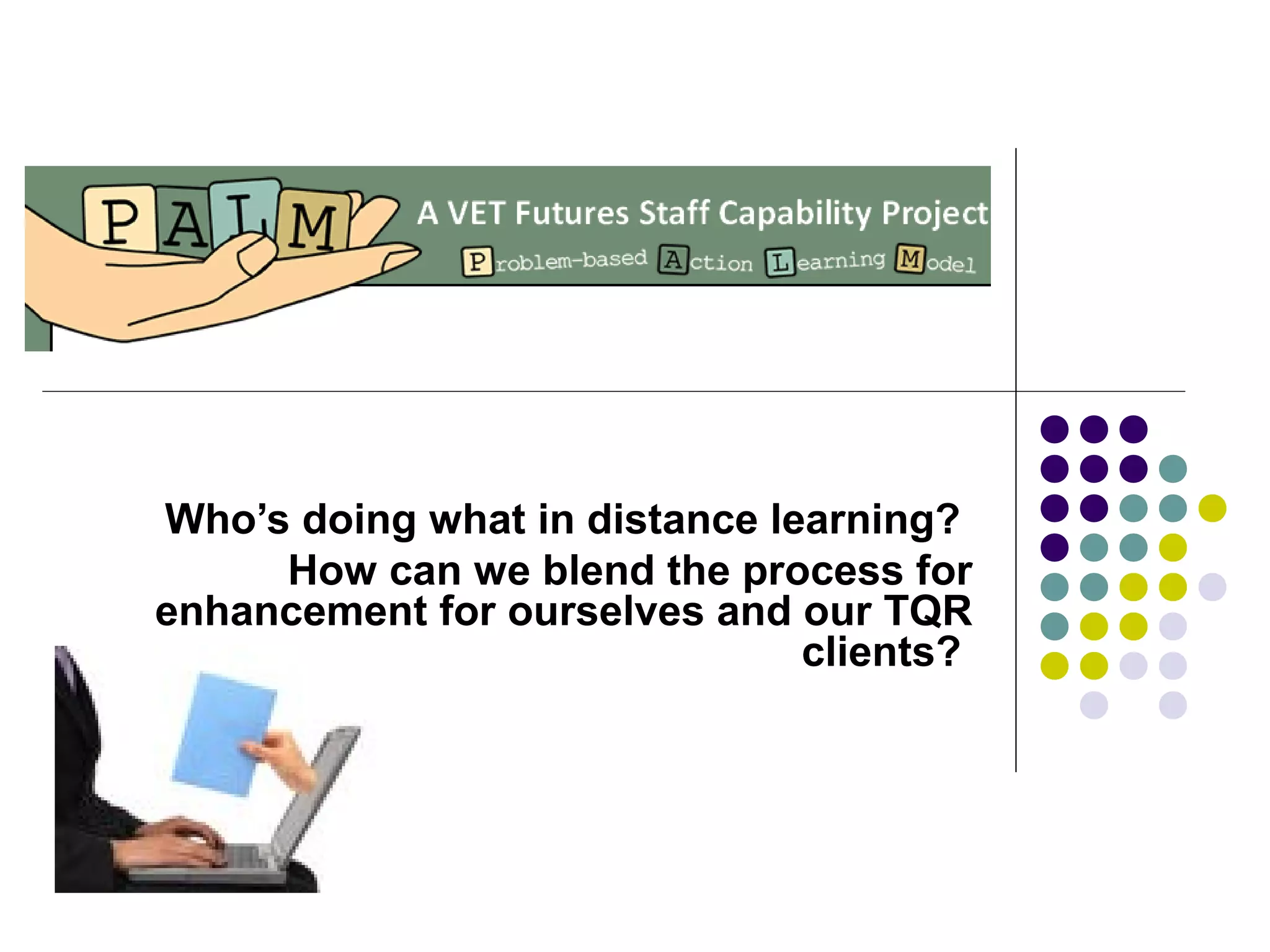 This document outlines aims and topics for a distance learning web conference trial for TQR staff. The conference aims to provide experience in distance learning, describe why reinvigorating distance learning is important for TQR's strategic plan, share experiences and ideas, identify issues to enhance practice, and evaluate web conferencing as professional development. Discussion topics include the history and definitions of distance learning, challenges, strategies used by other organizations, and next steps for improving TQR's distance learning approaches. Participants are asked to provide feedback to help improve future distance learning sessions.