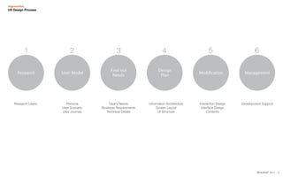 The document provides details on designing a mobile app for market researchers. It includes personas, user journeys, needs analysis and design plans. The target user is a market researcher named John who needs an intuitive app to efficiently manage his schedule of site visits, collect customer data and send reports. The design plans showcase information architecture, screen layout concepts with sketches and detailed interactions through prototypes. The goal is to design an app that minimizes clicks and travel time for John to complete his tasks.