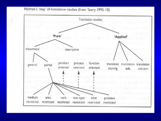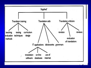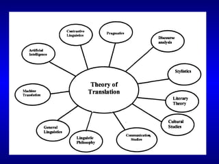 This document discusses various theories and perspectives related to translation theory, and their application to non-literary texts. It covers linguistic, cultural, philosophical, and postcolonial approaches. The document aims to provide an outline of translation theories in the 20th century, show how they apply to non-literary texts, and demonstrate how translation practice can benefit from theory.