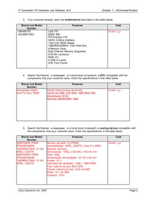 The document is a worksheet for a student to research computer components that are compatible with components a customer already owns. The student must find specifications for a power supply, CPU, cooling device, RAM, and video adapter card that match the form factor, socket type, and front side bus speed of the case, motherboard, and other owned components provided in the tables. The motherboard must be compatible with all other computer components.