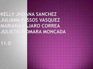 This document appears to list the names of four students - Kelly Jhoana Sanchez Juliana Passos Vasquez, Mariana Pajaro Correa, and Julieth Xiomara Moncada - along with their class, 11-D. It may be listing students for a computer science or IT project or assignment.