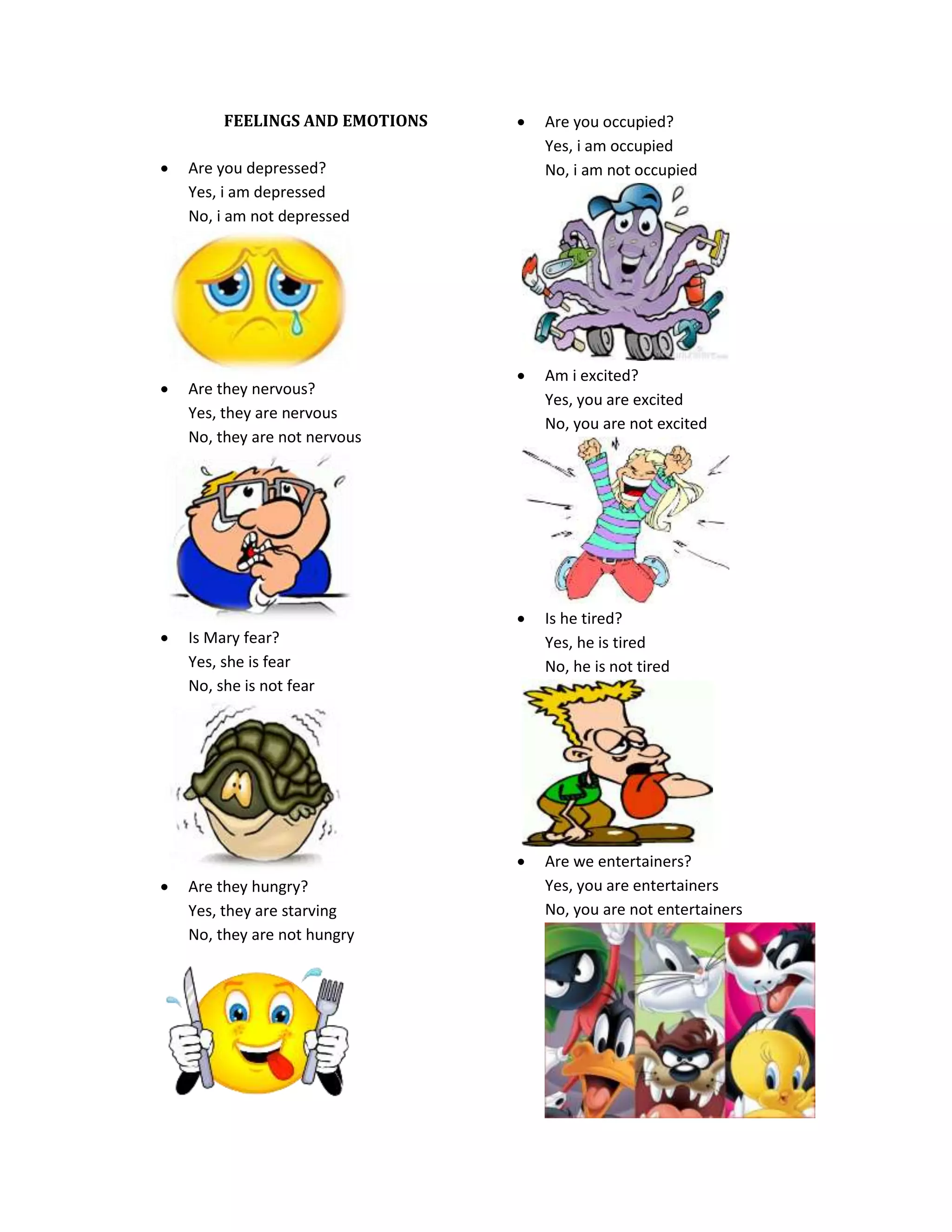The document contains sample questions and responses about feelings, emotions, and whether certain objects are present or not. It addresses questions about whether a person or group of people feel a certain way, such as nervous, excited, tired, etc. It also contains examples of questions using "is/are there" to inquire about the presence of objects in different locations and rooms, and may include follow up questions about quantities.