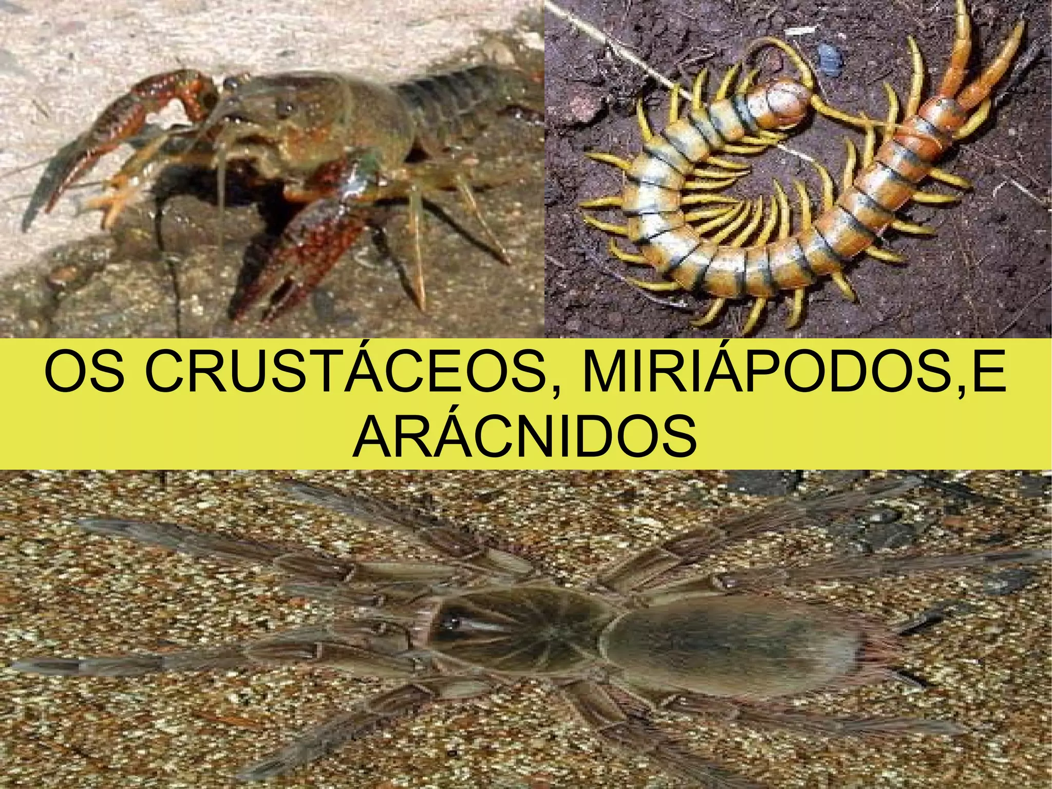 OS CRUSTÁCEOS Características:Teñen un caparazón ou costra que os protexe.(maioritariamente as branqueas ). Posúen patas articuladas.(non todos) Experimentan mudas para medrar. Respiran por branqueas, e os pequenos utilizan a respiración cutánea. Teñen formas moi variadas entre sí. O seu corpo esta dividido en celefatórax e abdome. Posuen antenas ( non todos ), y un par de mandíbulas e detrás unhas maxilas. Soen ser de cores escuras.