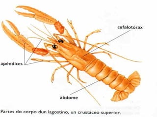 Crustáceos superiores: Teñeno celefatórax cuberto por unha coiraza posúen un abdome que está protexido por seis aneis, Dous ollos, antenas e unha mandíbula mastigadora. Exemplos: centolas, nécoras, langostinos TIPOS
