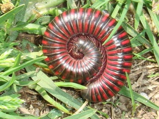 O MIRIÁPODOS TiposDiplópodos: Distínguense dos outros pola cabeza disposta verticalmente e grande, o corpo cílindrico, por ter aneis grandes, e levar entre seis e sete pares de patas cada un.