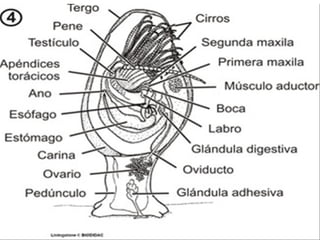 PARTES DO CORPOAs partes máis importantes son: Os apéndices: Saen da parte dianteira do corpo e teñen función locomotora ( desprazarse ) respiratoria e absorven partículas da auga, mediante unhas sedas que desenvolven. O celefatórax: Chámase así xa que a cabeza está pegada o corpo . É a parte donde de atopan os órganos máis importantes do crustáceo. O abdome: É a parte que se atopa na parte final do crustáceo.